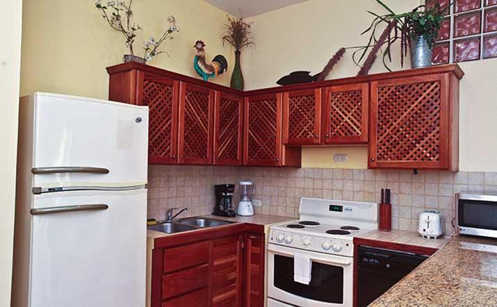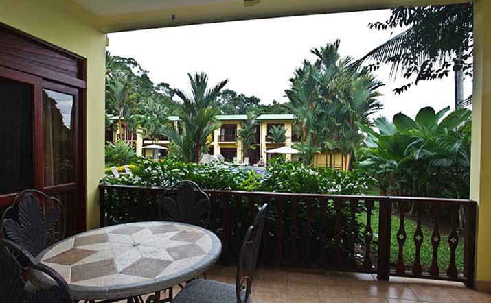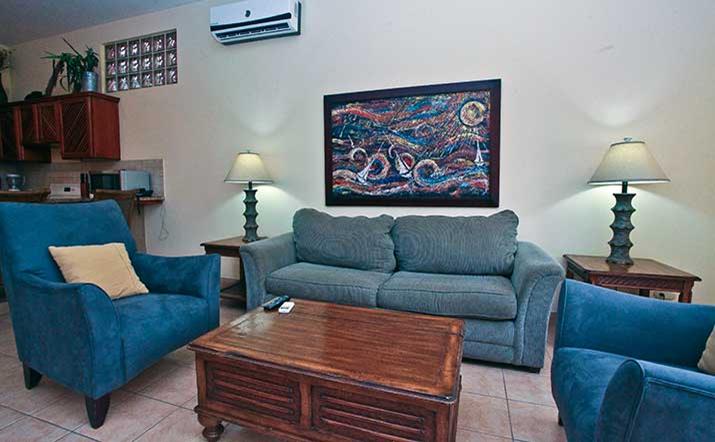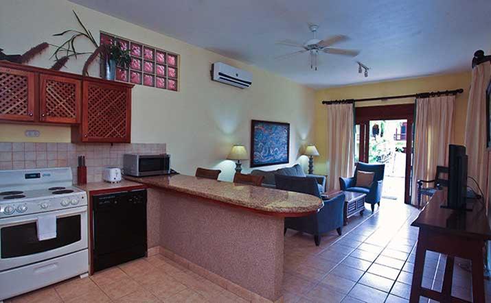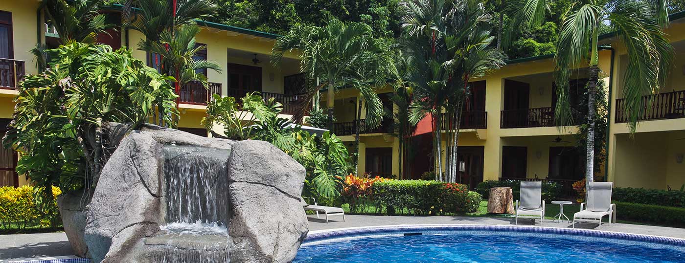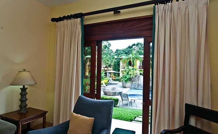 These luxurious two bedroom condominiums can accommodate up to six people. All condominiums are steps from the private swimming pool and waterfall. You will have an on-site office for check in/out, where we provide services for booking tours, transfers, fishing trips, and other activities. Daily maid service, full time maintenance, 24 hour security, cable TV, free wireless high speed Internet, and excellent air conditioning units. Kitchens are fully equipped for you to make your own meals and sit out on your private patio with your family dining. Washer and dryer units also are provided for your use. A Jenn-air BBQ grill is available at the pool-side area for our guests. Nestled in a beautifully lavished garden in the jungle within a small gated community of 17 gorgeous condominiums with 24 hour security. Best of all, the surfing beach is a block away from your front door.