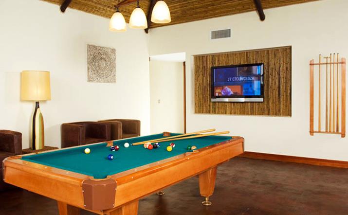 Casa Pacifica has an upstairs gathering game room with vaulted bamboo ceilings, a great bar and 50" plasma TV. This room has a great view to the Herradura Bay and features a custom pool table and other game tables.