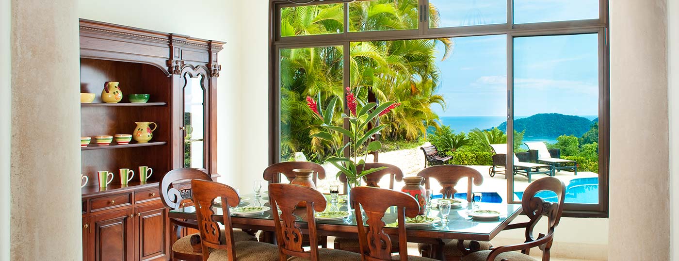 Casa Puesta del Sol is a beautiful five bedroom home located in the mountain top neighborhood of Vista Tres Bahias in Los Suenos Resort. With an elegant design and stunning panoramic vistas of the three different bays and the rainforest this home is ideal for families and groups that want to have a private house within Los Sueños with privacy and the best views.