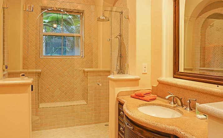 There are four bedrooms/four and one-half baths including the private guest house. It also features:
